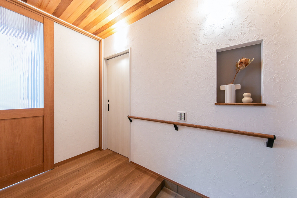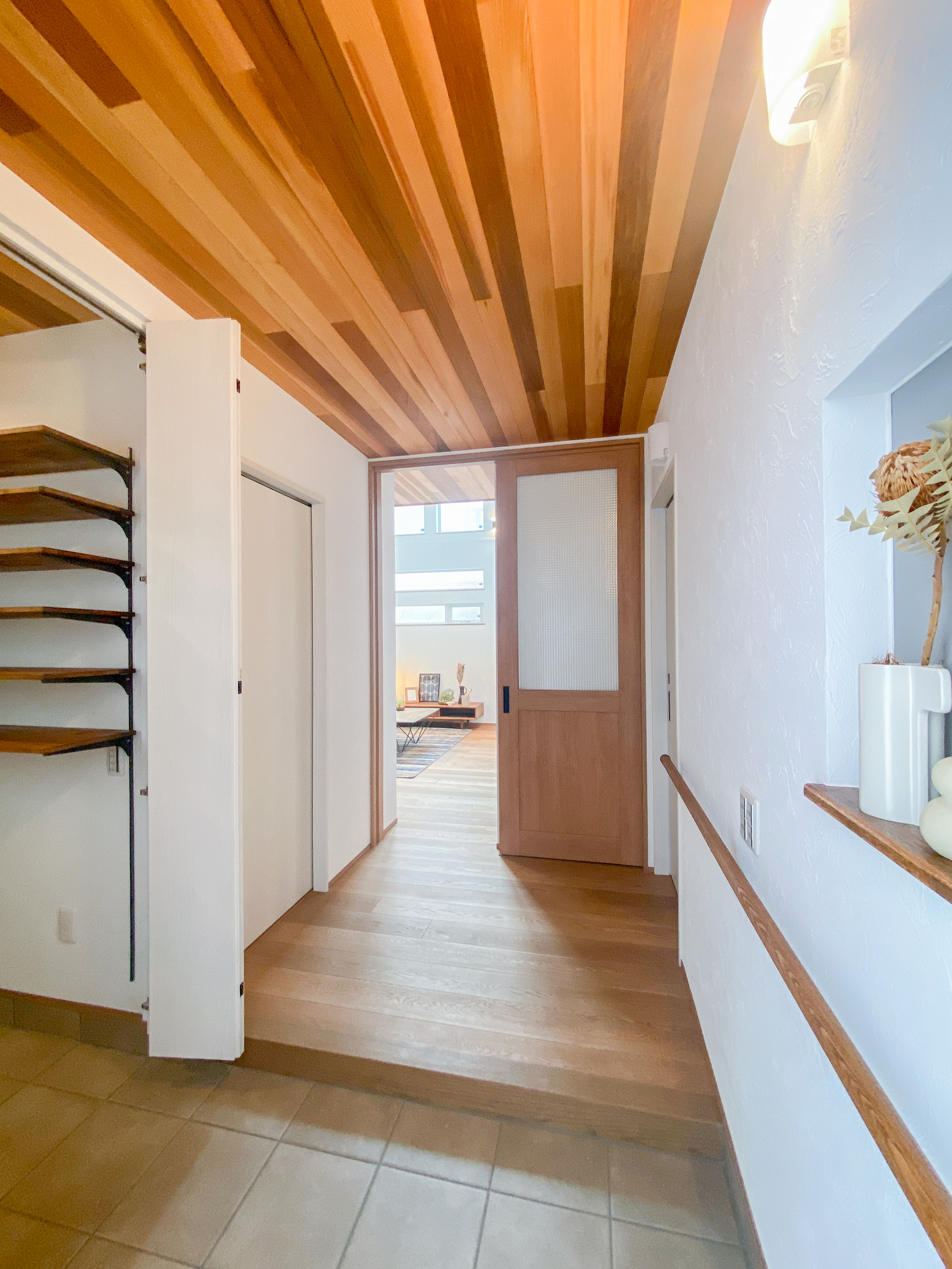 玄関ドアも引き戸にすることで、扉周りのスペースを確保しています。