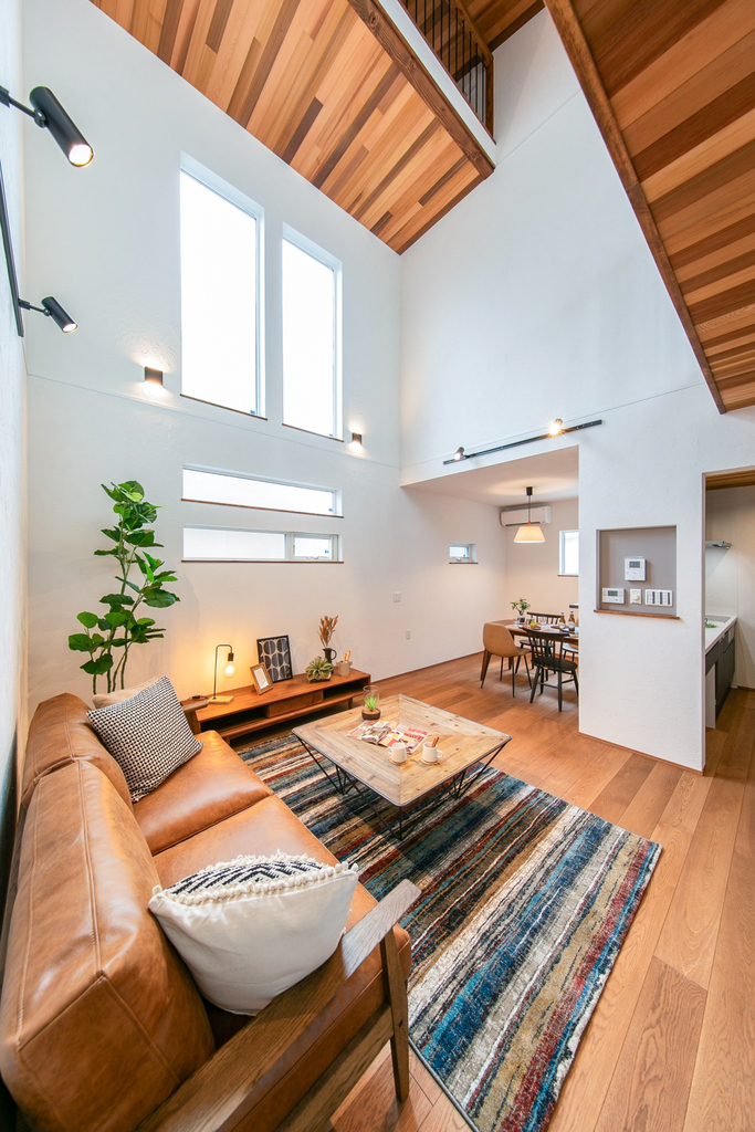大きな梁が見える吹き抜けが印象的な開放感のある家