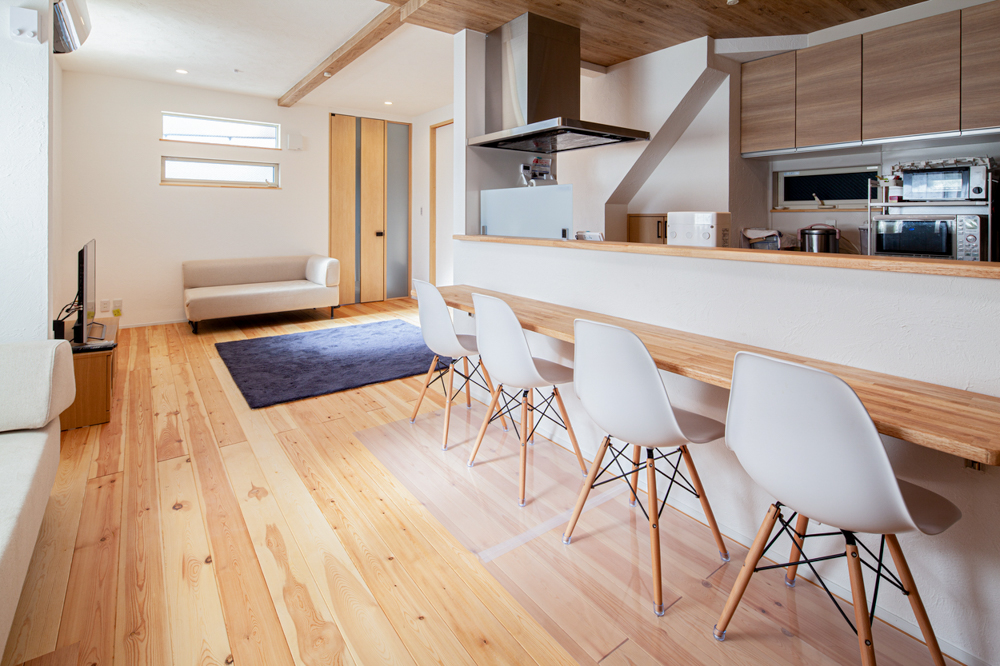 実際にキッチンの天井を無垢材にしてみると、天井が白一色になるよりも、無垢材があることにより、暖かみが増し、「無垢材にして良かった!」と夫婦共とても満足しています。