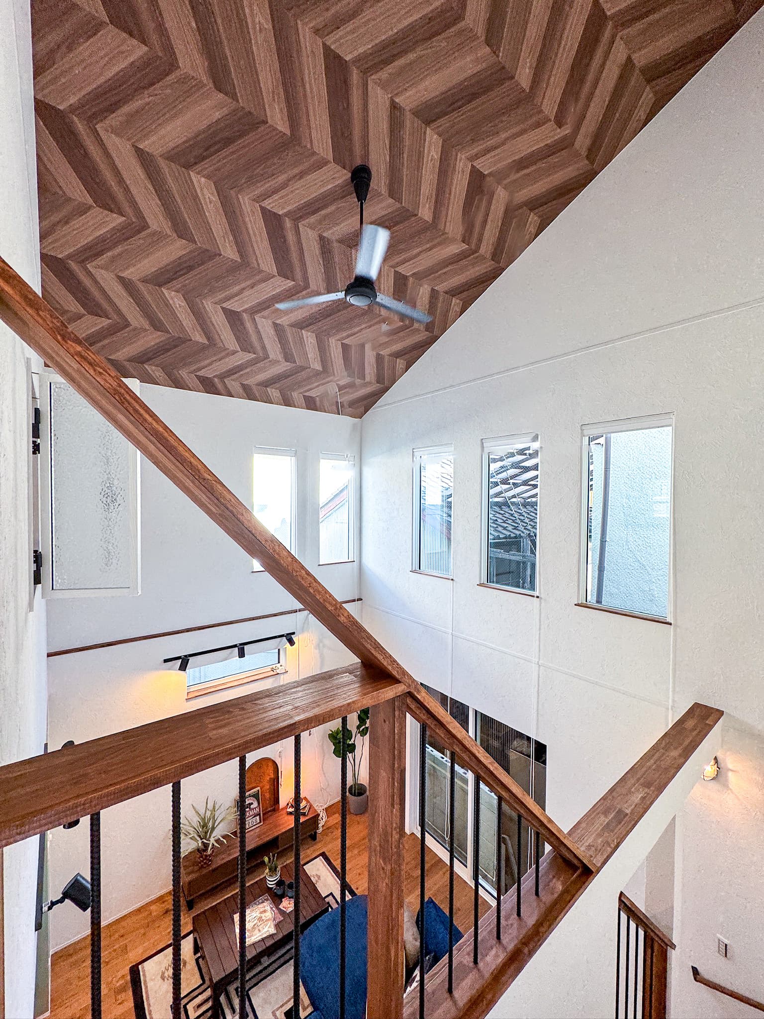 次にこだわったのは、吹き抜けと勾配天井による明るさと開放感です。