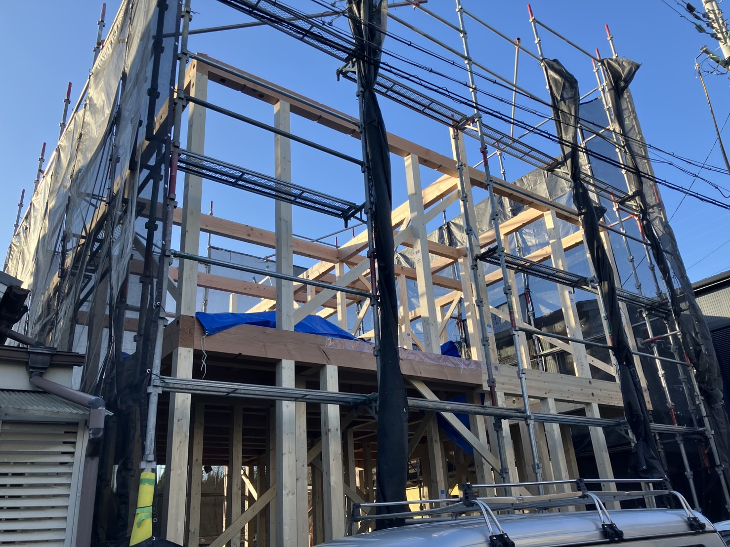 夕方には屋根のカタチも出来、棟上げ工事も完了です✨