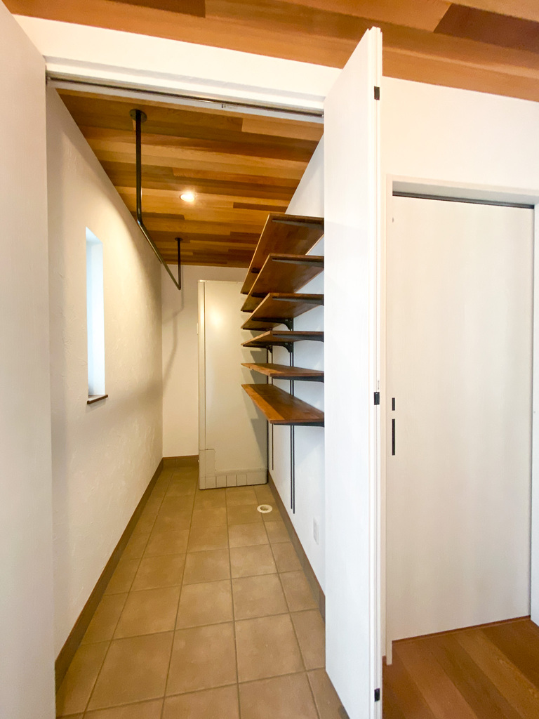 土間収納には可動式造作棚と天井付けのアイアンバーも設置。