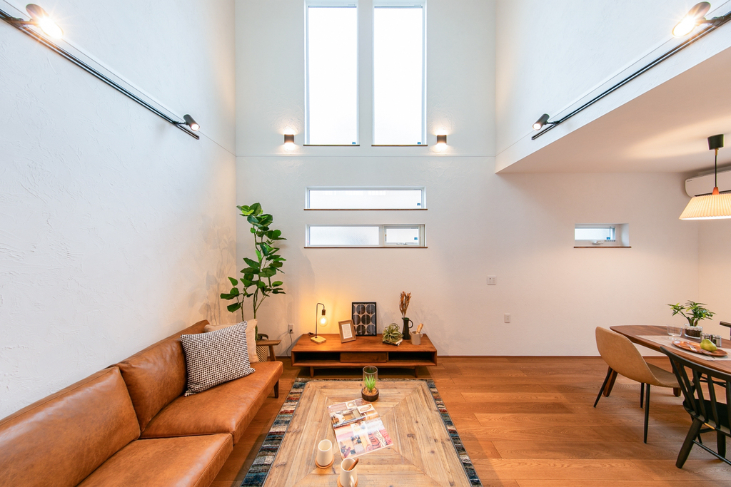 リビングに入ると大きな吹き抜けと窓から入る陽射しが心地よい