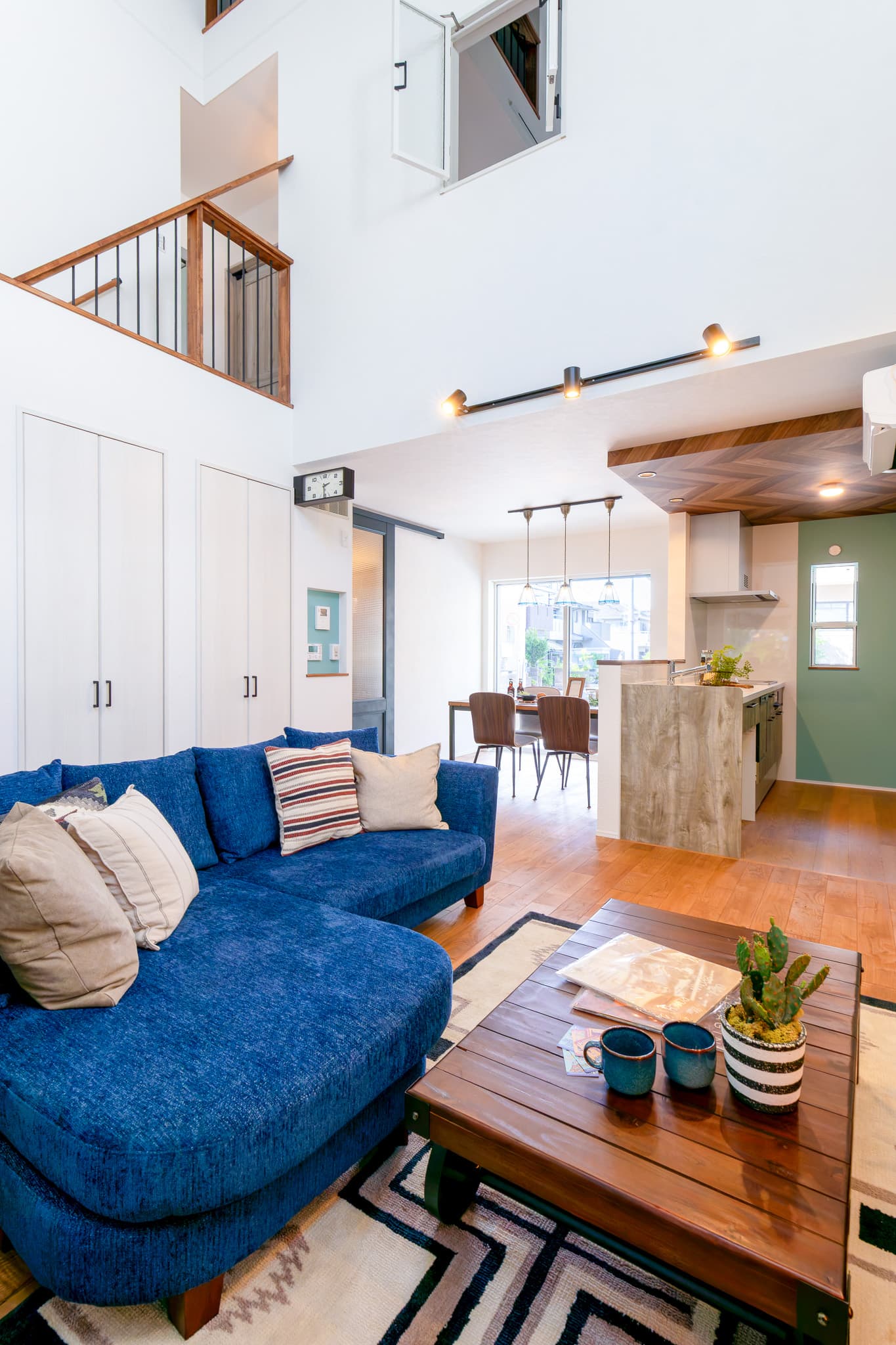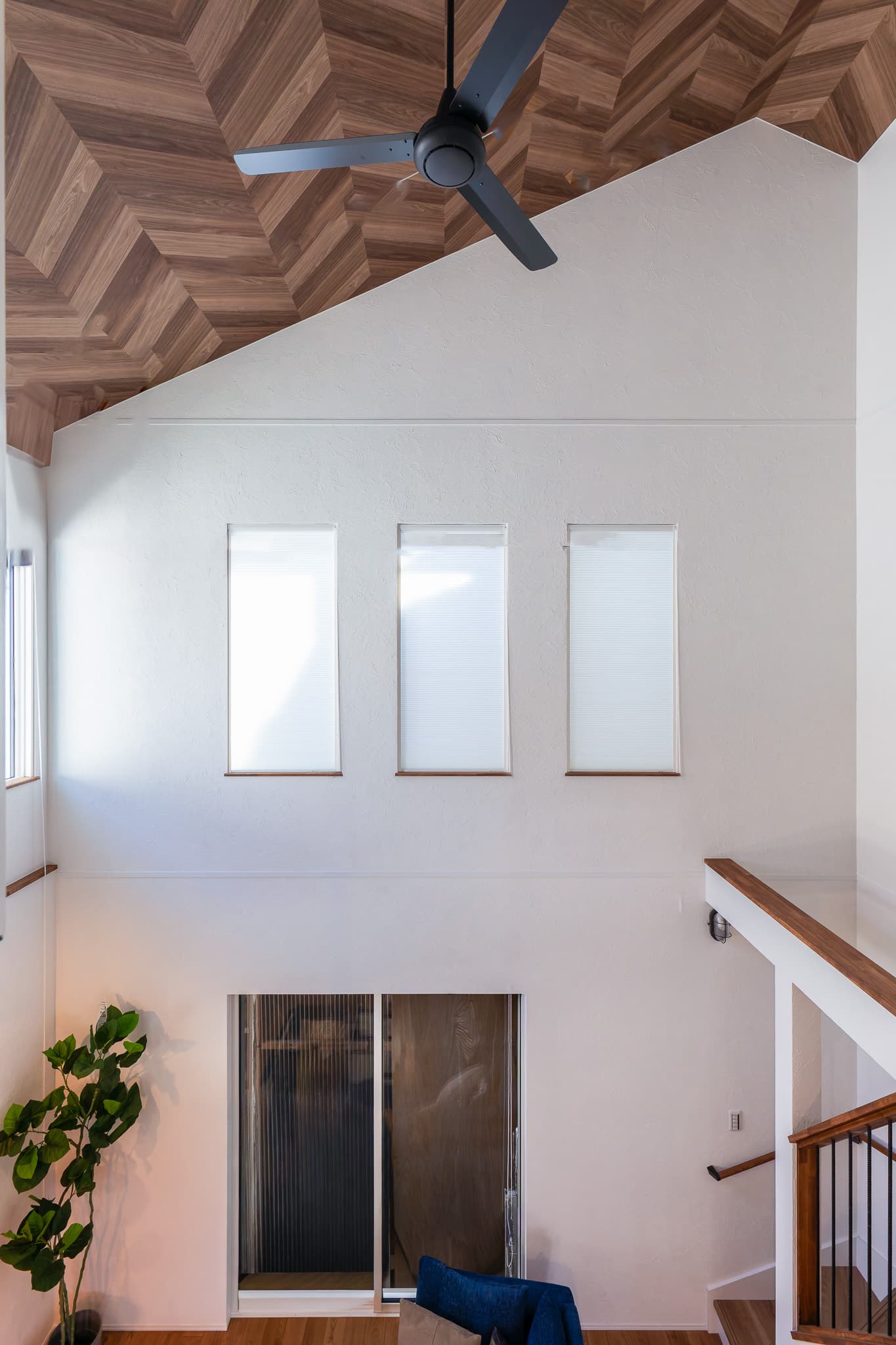 次にこだわったのは、吹き抜けと勾配天井による明るさと開放感です。